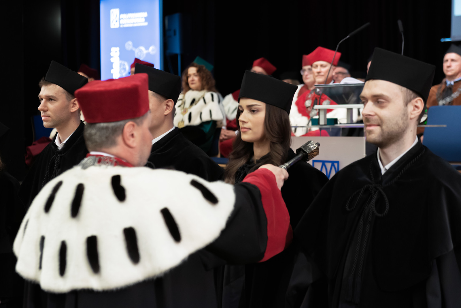 Ważną częścią uroczystości było ślubowanie przedstawicieli studentek i studentów pierwszego roku, które poprowadziła prorektor ds. kształcenia dr hab. Iwona Włoch, prof. PRz, oraz przedstawicieli doktorantek i doktorantów Szkoły Doktorskiej Politechniki Rzeszowskiej, które poprowadził prorektor ds. nauki dr hab. inż. Lesław Gniewek, prof. PRz. JM Rektor dokonał pasowania studentek i studentów oraz doktorantek i doktorantów.