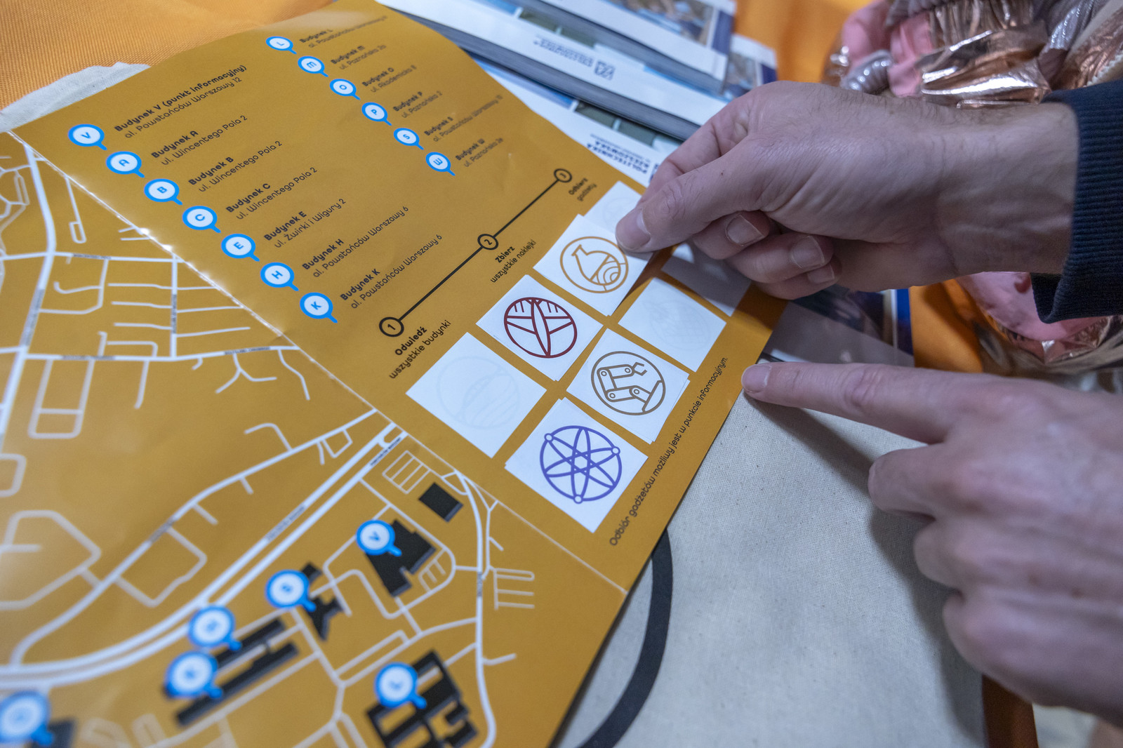 Zwiedzenie warto było rozpocząć od budynku V, gdzie poza strefą pokazową i wystawienniczą z mnóstwem atrakcji znajdował się punkt informacyjny, w którym najmłodsi otrzymywali ulotkę, aby móc wziąć udział w zabawie polegającej na zebraniu ośmiu naklejek ukrytych na wydziałach uczelni. Komplet naklejek można było na koniec wymienić na okolicznościowy dyplom i upominek. Ponieważ teren Politechniki Rzeszowskiej jest rozległy, organizatorzy przygotowali przewodnik i interaktywną mapę uczelni w Google Maps, aby ułatwić uczestnikom poruszanie się po budynkach.
